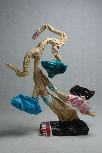 在2004年以前,我的作品主要是以传统古典形象为主题的金属焊接品。当时那批作品产生的原因主要有两方面,一是对传统的迷恋,另一个是对材料的迷恋。除此之外,我对金属直接焊接方式的过程特别有兴趣,它是一次性的,不可复制的,一气呵成的。这种状态让我兴奋,对以金属材料进行的戏仿也觉得有趣。传统的文化资源作为一个参照,始终与我们现实的思考和状态如影相随,我想这也是我的作品中“盆景”形式不断被借用的原因吧。然而,纵然始终保持着对材料和状态的兴趣,但在面对当今世界如此丰富如此鲜活的生活以及由此生出的种种体悟时,过去的方式便显得力不从心了。2002年的时候,我创作了一件带有装置色彩的雕塑《意外事件》。从那时开始,我对日常生活中被使用的一些物品开始产生了兴趣。象废弃的巨大的包装箱,被倒空后瘪瘪的牛奶盒、牙膏盒,被揉作一团的口香糖纸,被叠在一起的使用过的一次性纸杯,各种色彩的垃圾袋等等。我觉得这些被揉作一团、失去了固定形状的物品由于凝固了我们日常生活中各种无意识的信息,而具有了一种精神上的象征性,变得和我们息息相关起来。之后,发展到对现成品进行装置化的改造和戏拟,并以塑造的方式予以呈现。从“废铁”到各种现实生活中的包装物和废弃物,我发现,自己其实一直是对“物”的东西更感兴趣。