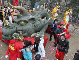 10日,巨型“年”雕塑在郑州的中原民俗庙会上向公众亮相。人们可以从其腰部穿过,寓意“‘过年’腰缠万贯,福寿无边”;而从“年”雕塑的背部跨过,则寓意“智勇双全,事业成功”。