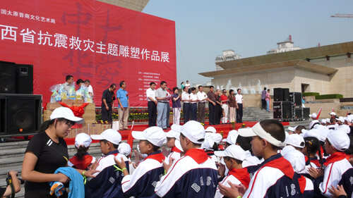 开幕式上,一群特殊的小朋友也来到现场,他们是来自重灾区四川茂县洼底乡、现就读于太原大众传媒学校的210名小学生。省市领导代表活动组委会向来自重灾区的同学赠送了学习用品。这些以“抗震救灾”为题材的雕塑作品震撼着每一个参观者的心灵,更引起来自四川的210名师生的共鸣。四川省茂县洼底乡教师说:“这些场面会让我想起地震后的很多很多,所有的画面都是我亲眼目睹的,看到这么漂亮的雕塑,我会更好的教育我们这些学生能够更好的学习。”