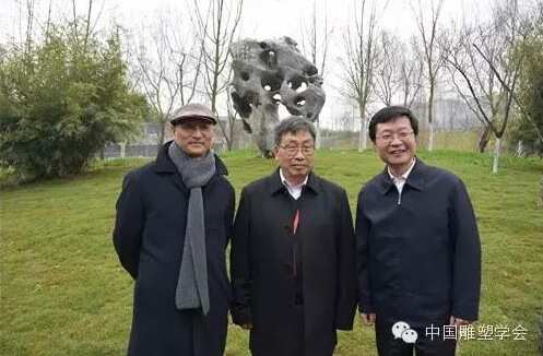 曾成钢(左)、贺中令(中)、潘朝辉(右)在贺中令作品《米芾拜石》前